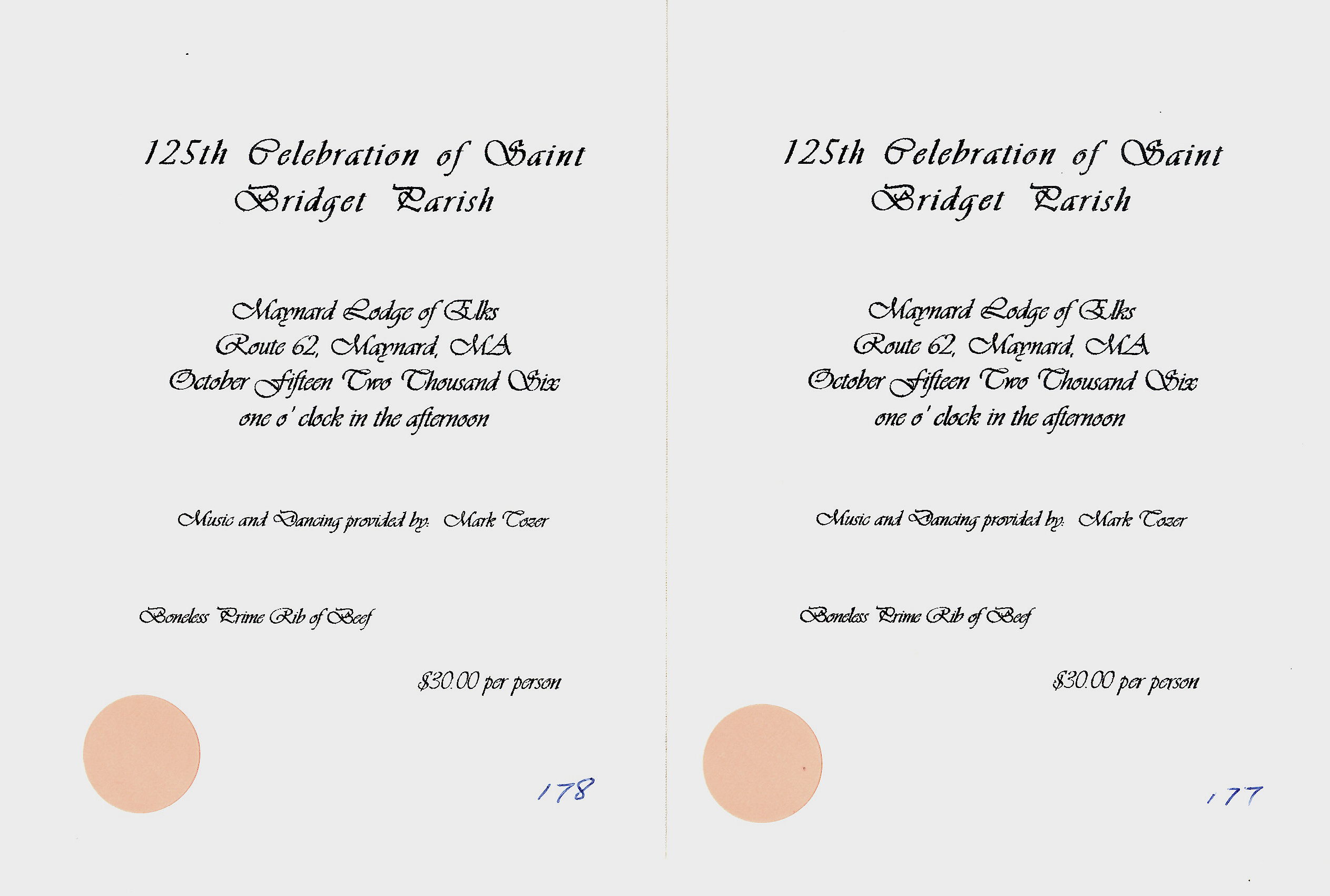 Pair of tickets to the 125th anniversary celebration of Saint Bridget's Parish. The event was held at the Maynard Lodge of Elks, Route 62, Maynard, MA on October 15, 2006 at 1:00 in the afternoon. Music and dancing were provided by Mark Cozer. The dinner was boneless prime rib of beef. The tickets cost $30.00 per person. Ticket numbers 177 and 178