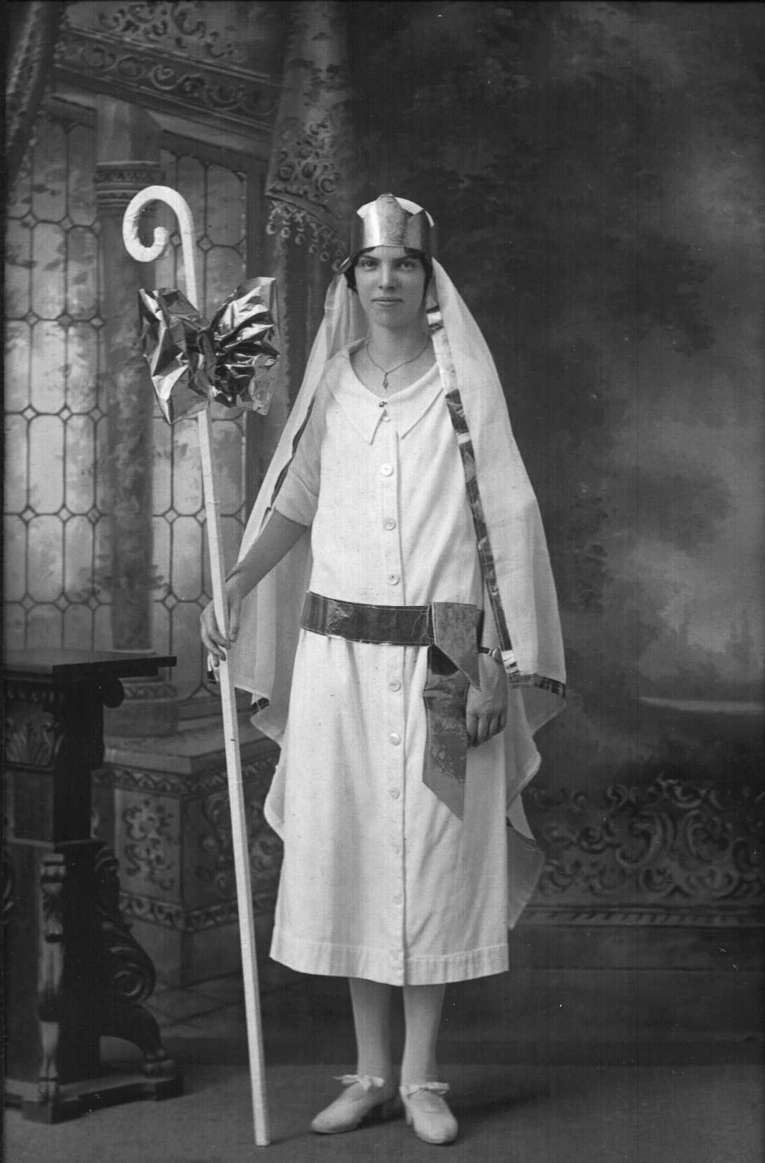 Portrait of Pauline Clark (m. Hirons) dressed in a ceremonial costume used for a Catholic pageant or feast celebration associated with the Children of Mary Sodality at St. Bridget’s Church.
