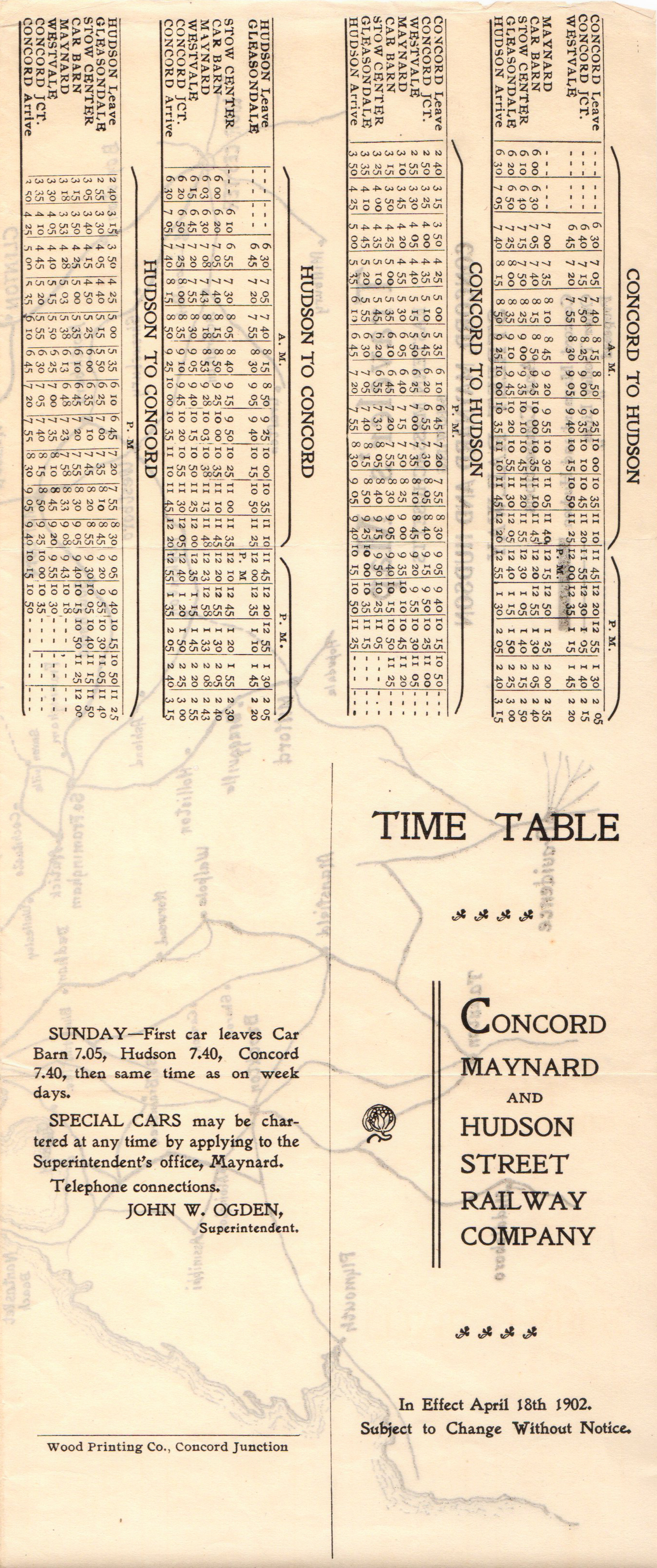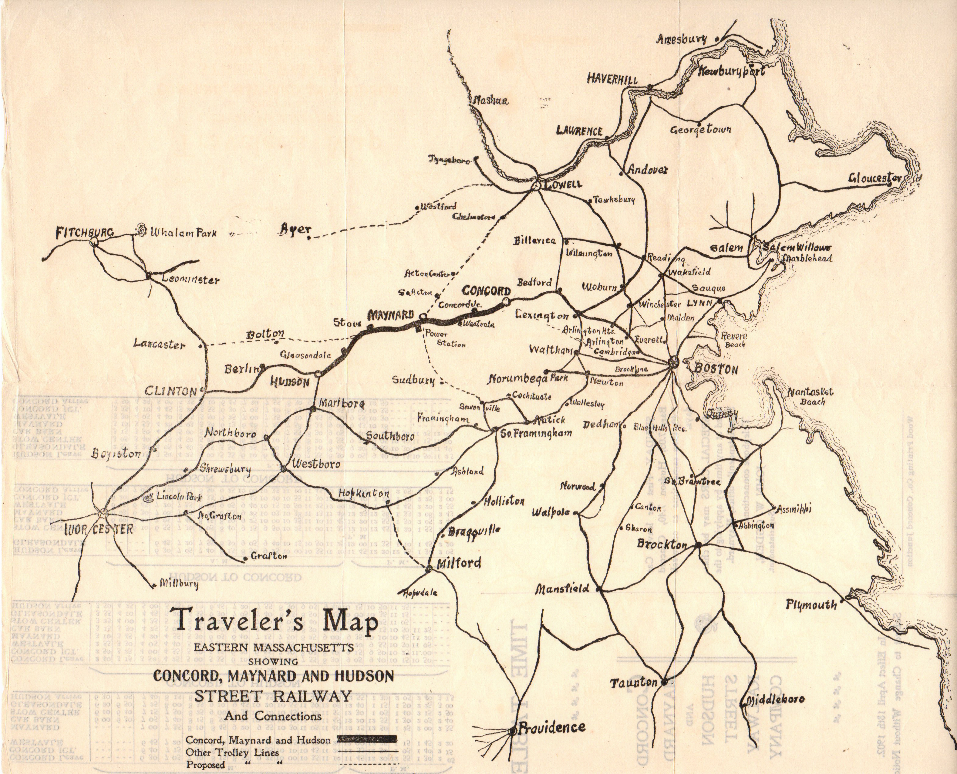 A map, 1902, titled 'Traveler's Map Eastern Massachusetts Showing Concord, Maynard and Hudson Street Railway and Connections' and Time Table. An original copy of the first schedule printed on both sides of thin and partially translucent paper. One side is the map, the other side is the trolley schedule indicating stops at Concord, Concord Junction, Westvale, Maynard Car Barn, Stow Center and Gleasondale.