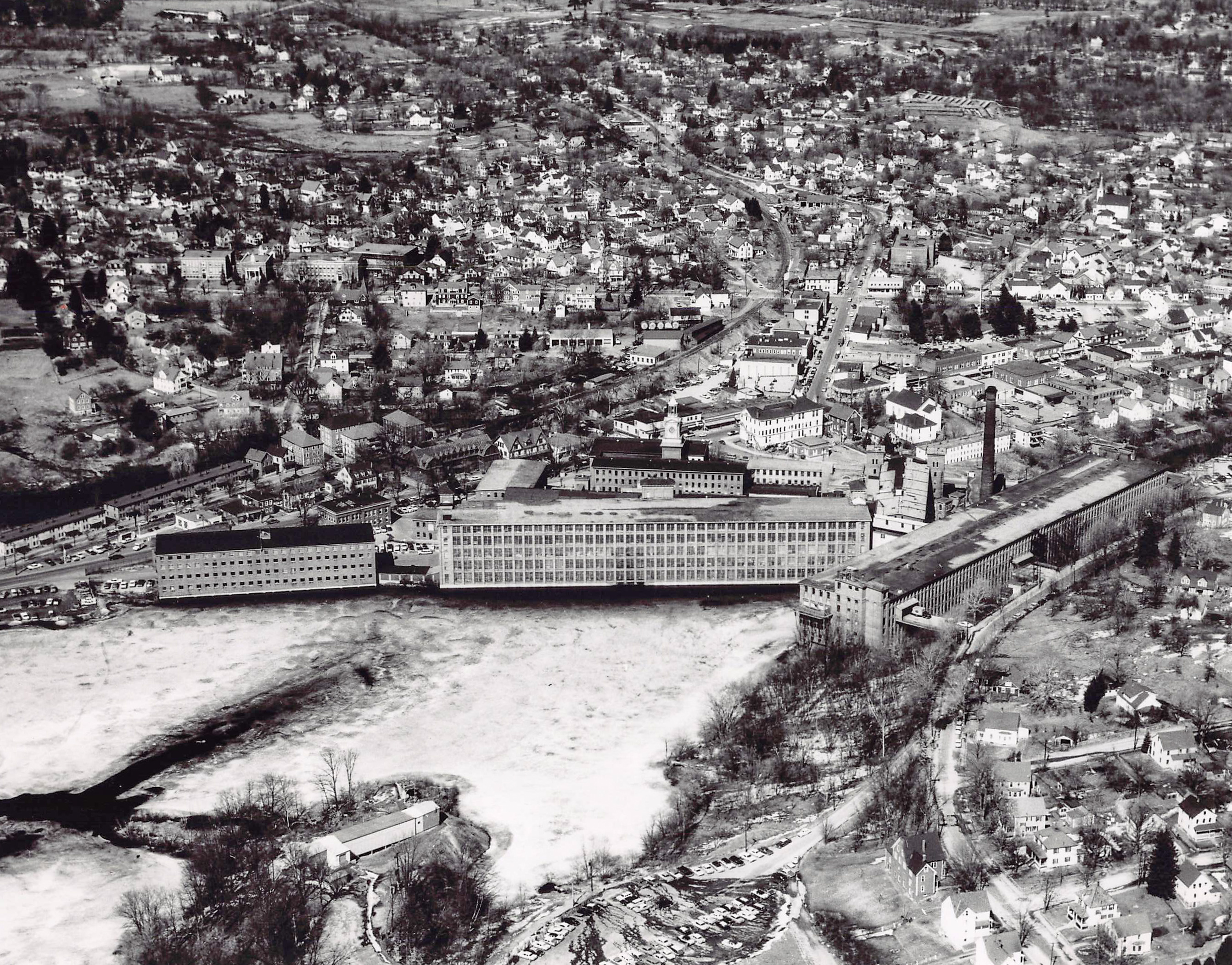 A black and white aerial photograph of the Mill complex during the Maynard Industries era.