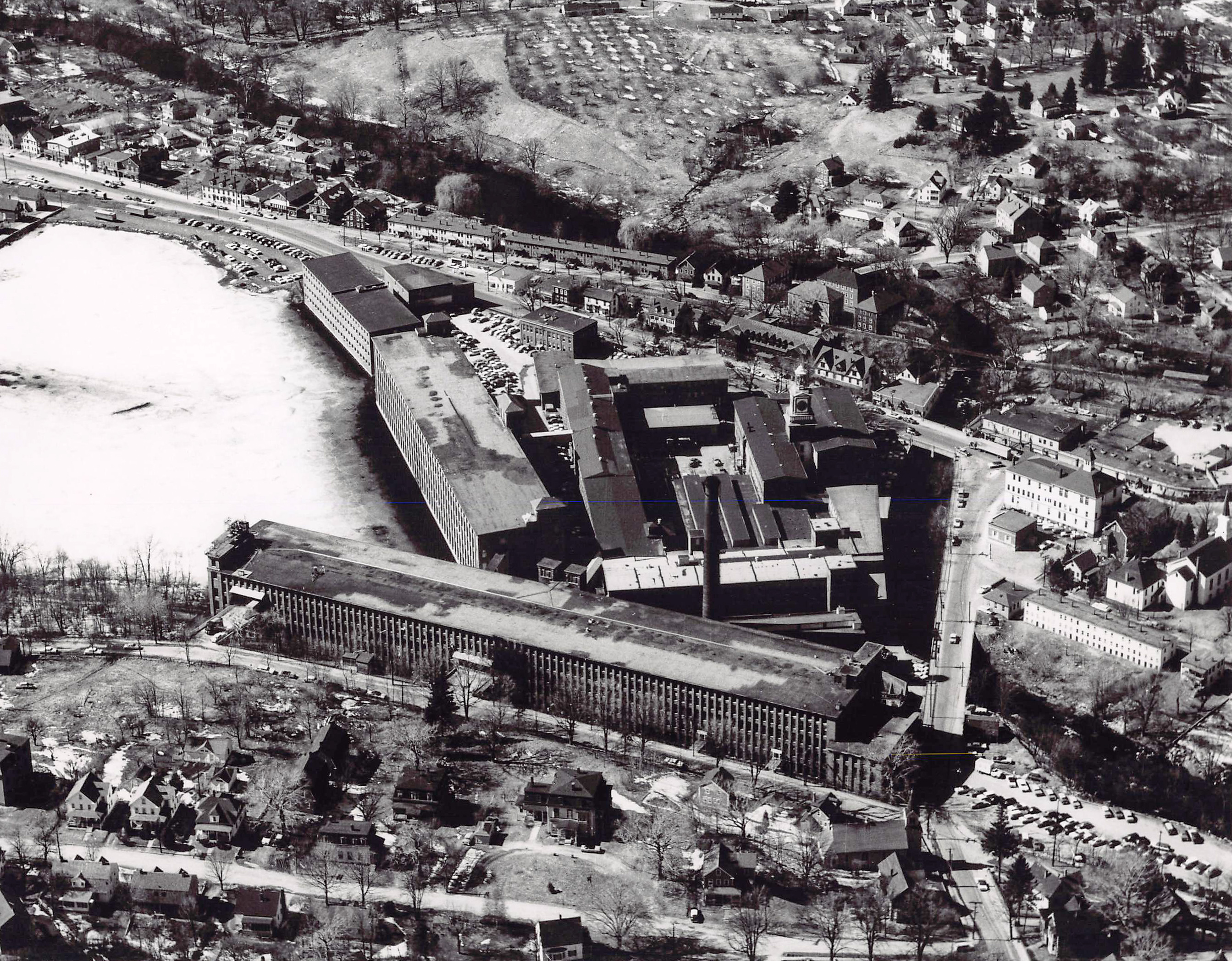 A black and white aerial photograph of the Mill complex during the Maynard Industries era.