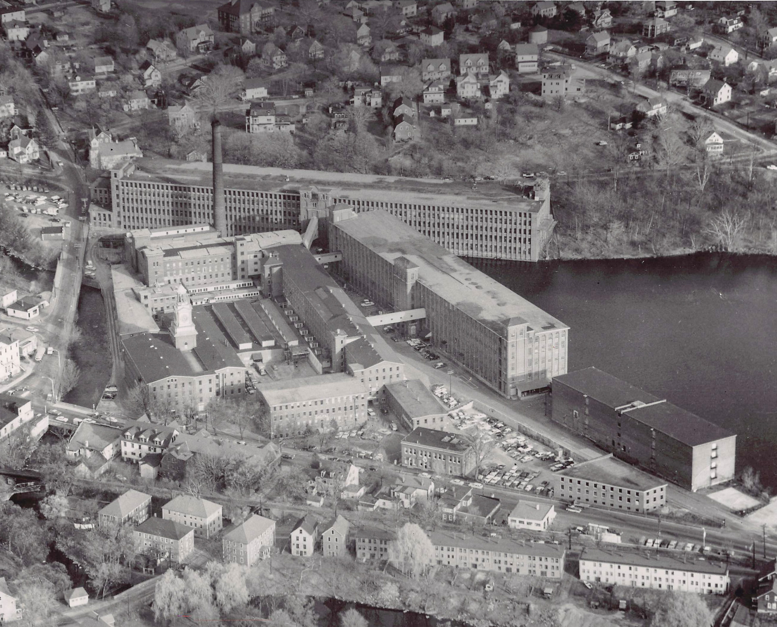 This photo provides an aerial perspective of the mill from the Assabet River looking southeast towards Main Street and Thompson Street.