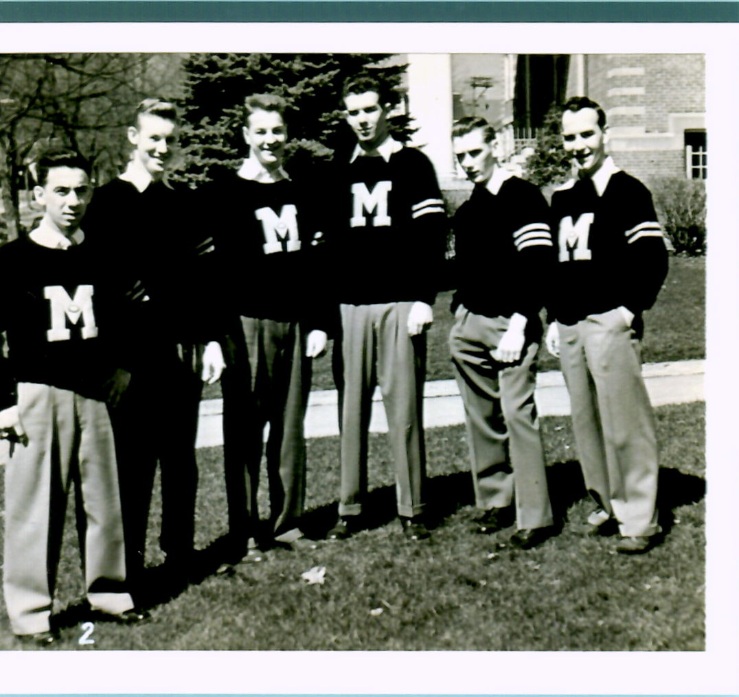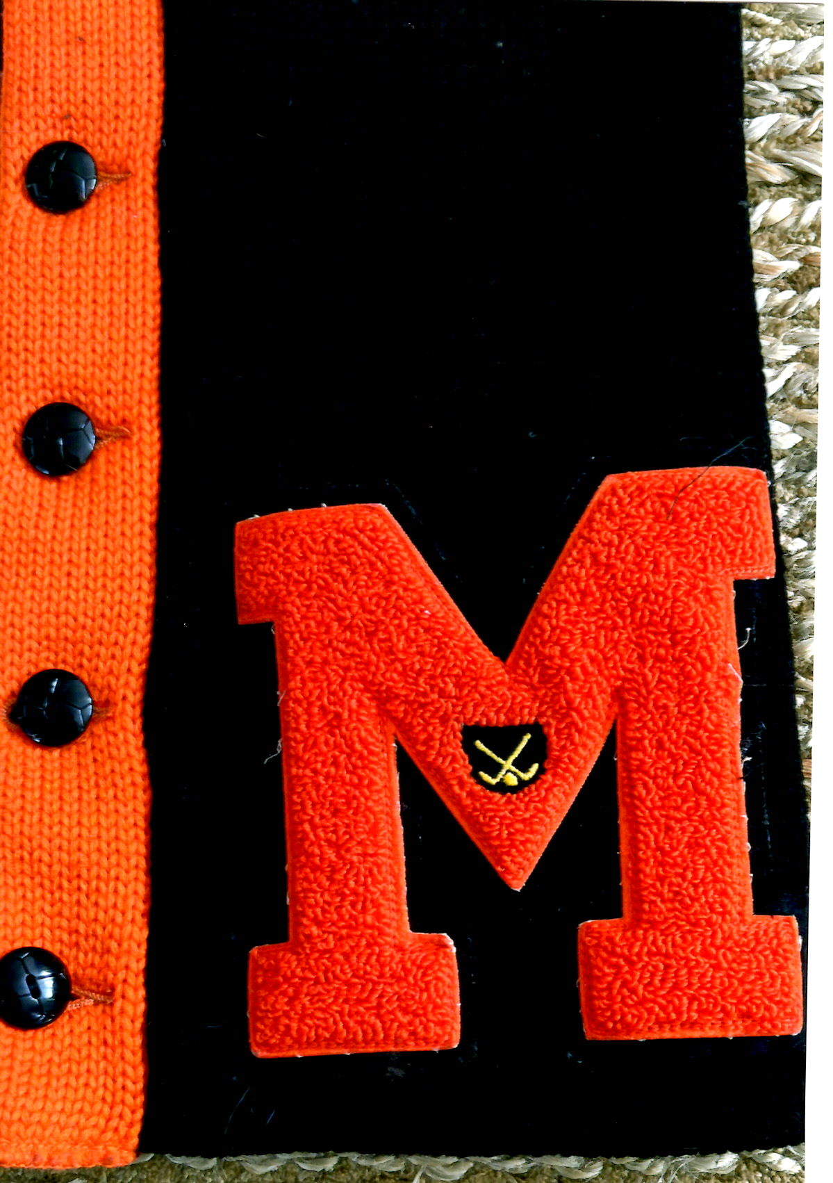 There have been different letter sweaters over the years. In 1952, there was an “M” on the front of a black crewneck sweater. In 1955, there was an "M" on a black cardigan sweater with orange trim. In 1962, the lettermen and women formed an “M” on the steps to the old George Washington Auditorium on Summer Street. (Their sweaters were probably not available yet.)