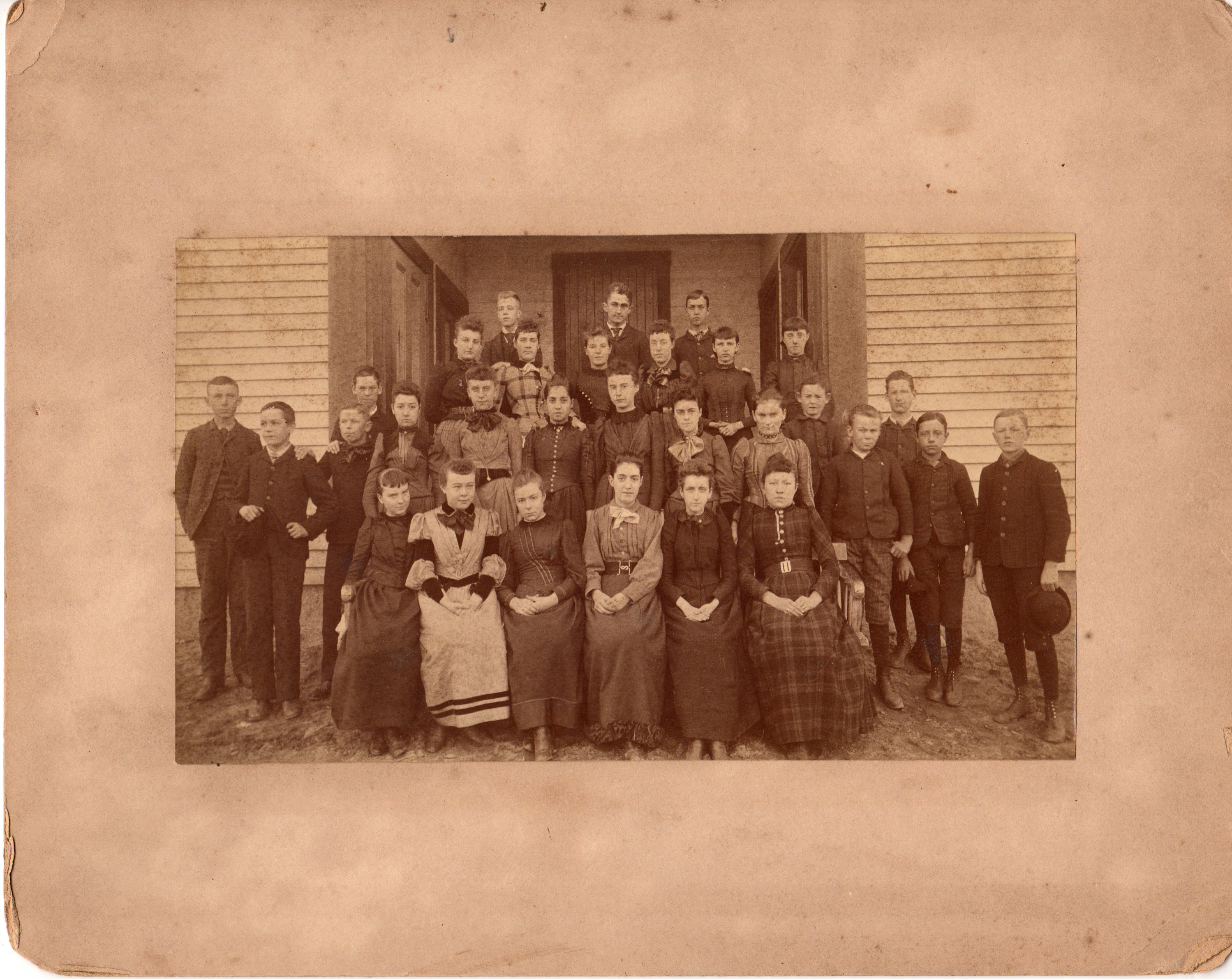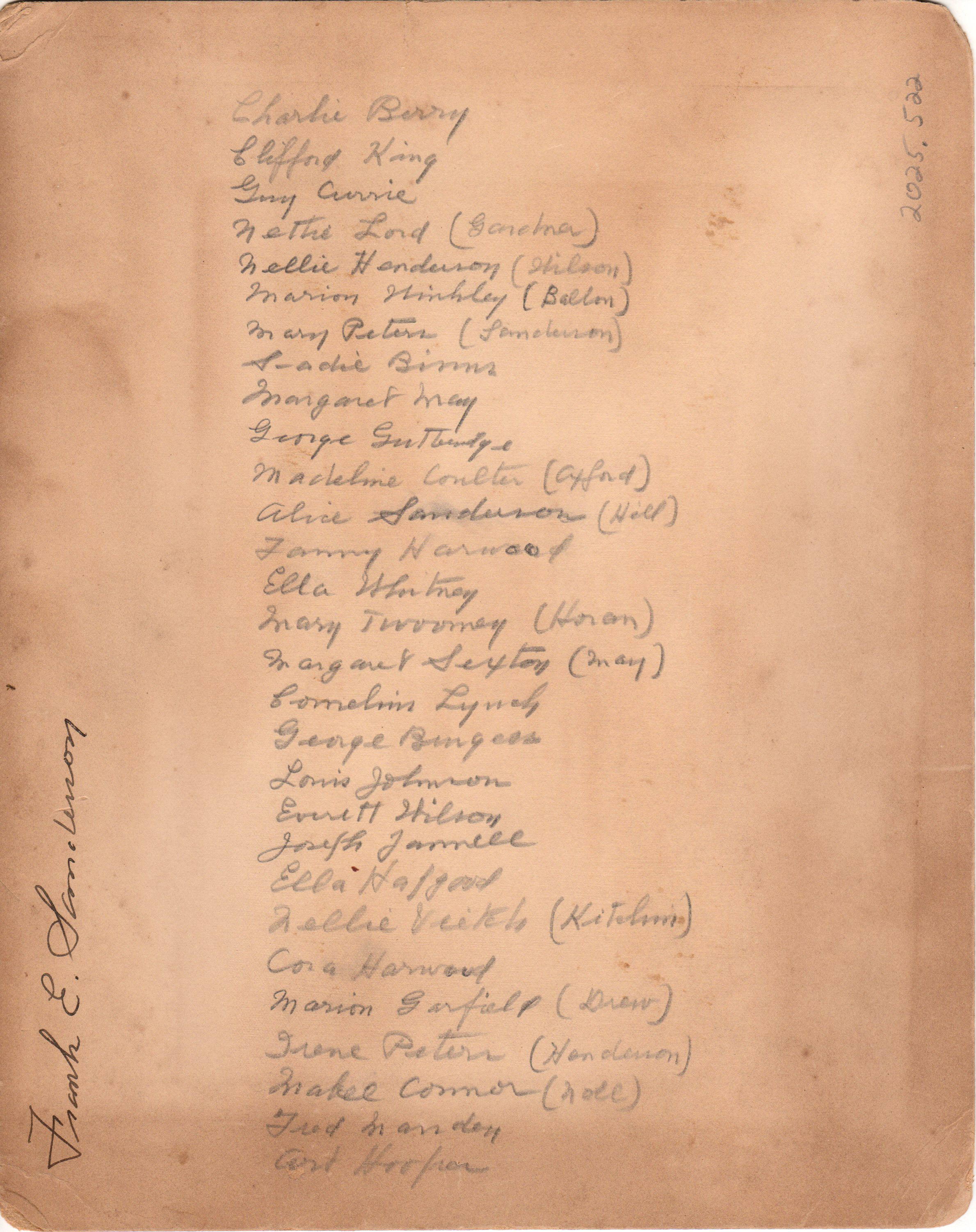 Charlie Berry, Clifford King, Gary Currie, Nettie Lord, Marion Winkley (Ballon), Nellie Henderson (Wilson), Mary Peters (Sanderson), Sadie Binns, Margaret May, George Gutteridge, Magdaline Coulter (Axford), Alice Sanderson (Hill), Tommy Harwood, Ella Whitney, Mary Twoomey (Horan), Margaret Sexton (May), Cornelius Lynch, George Bingass?, Louis Johnson, Everett Wilson, Joseph Jarmell?, Ella Hapgood, Nellie Viekla (Kitchum)?, Cora Harwood, Marion Garfield (Drew), Irene Peters (Henderson), Mabel Connor (Noll?), Fred Mandan, Art Hooper