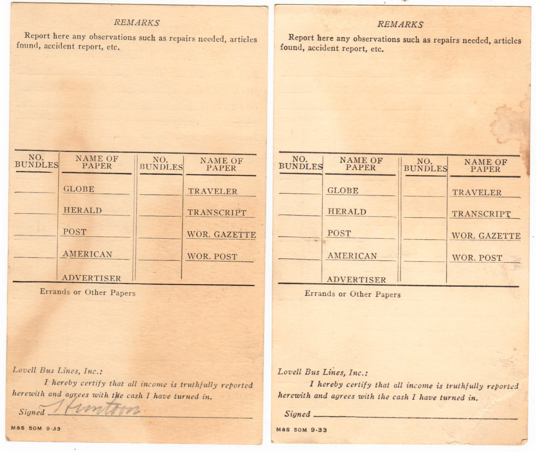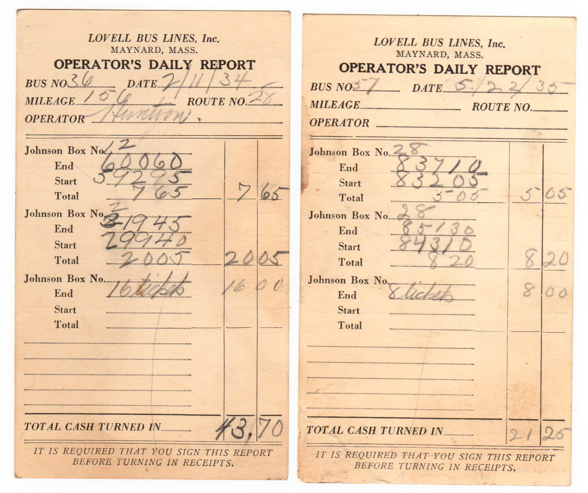 Two daily reports turned in by Earl Huntoon, a driver for Lovell Bus Lines in the 1930's. A Johnson Box is the fare box located at the front of the bus.
