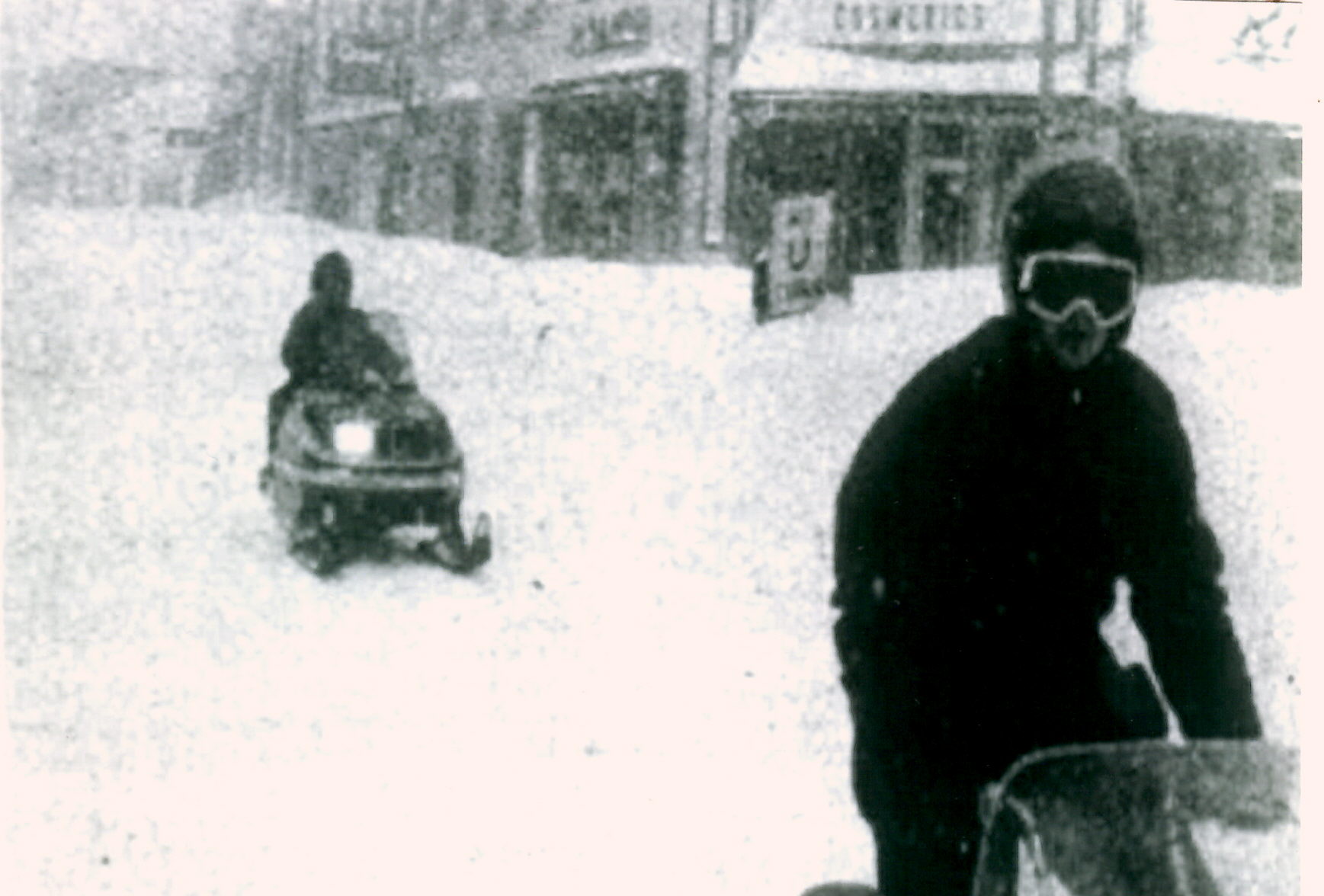 The blizzard occurred February 6-7, 1978. The photo shows two snowmobiles at the intersection of Main and Nason Streets. The photo was probably taken on February 7th and appeared in the Assabet Valley Beacon on February 9, 1978. In the background is Rickles Cosmetics, Rainvilles, and Century 21 Real Estate.