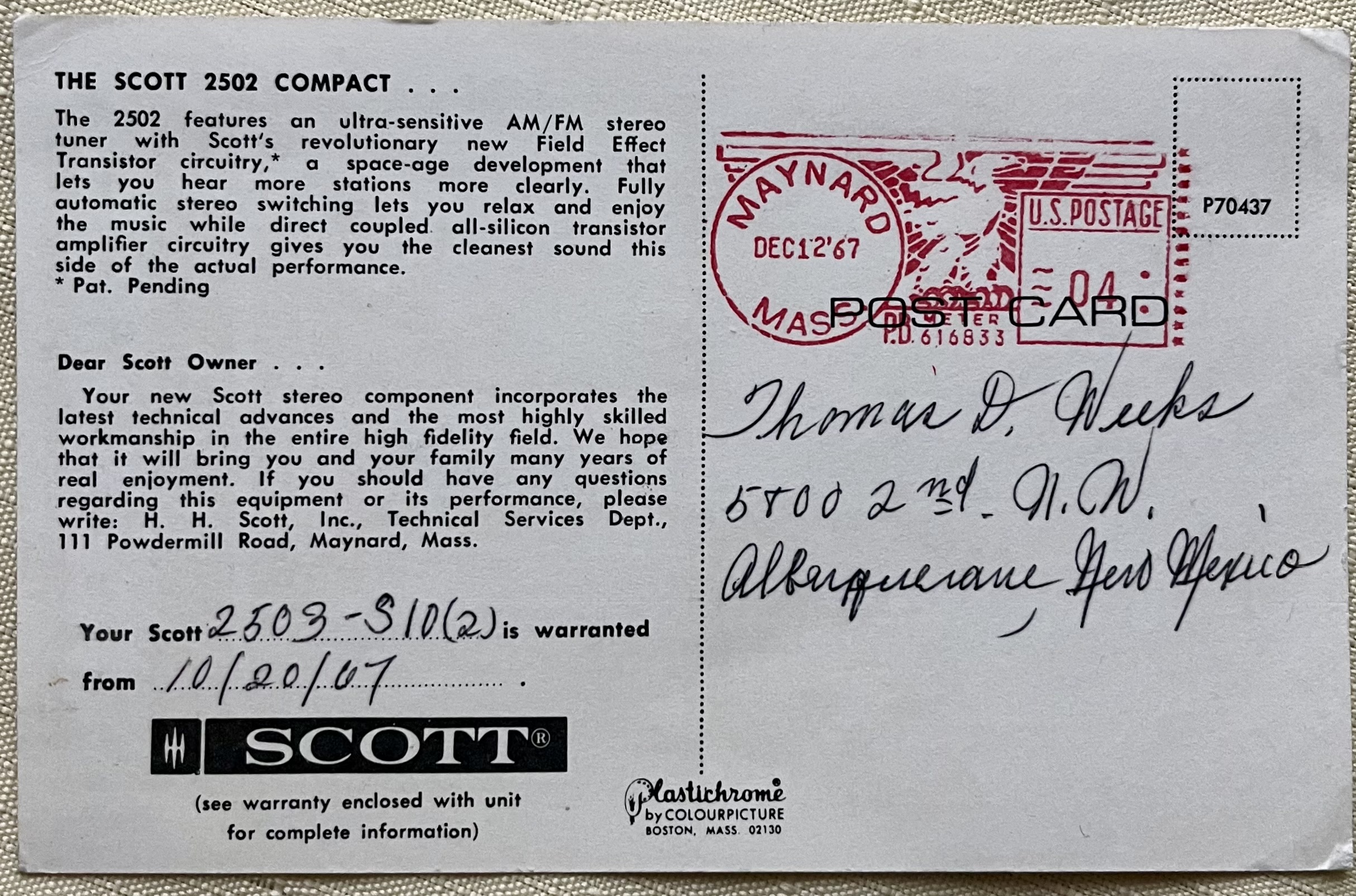 A card sent to Thomas D. Weeks of Albuquerque, New Mexico from H. H. Scott of Maynard with warranty information for his stereo.