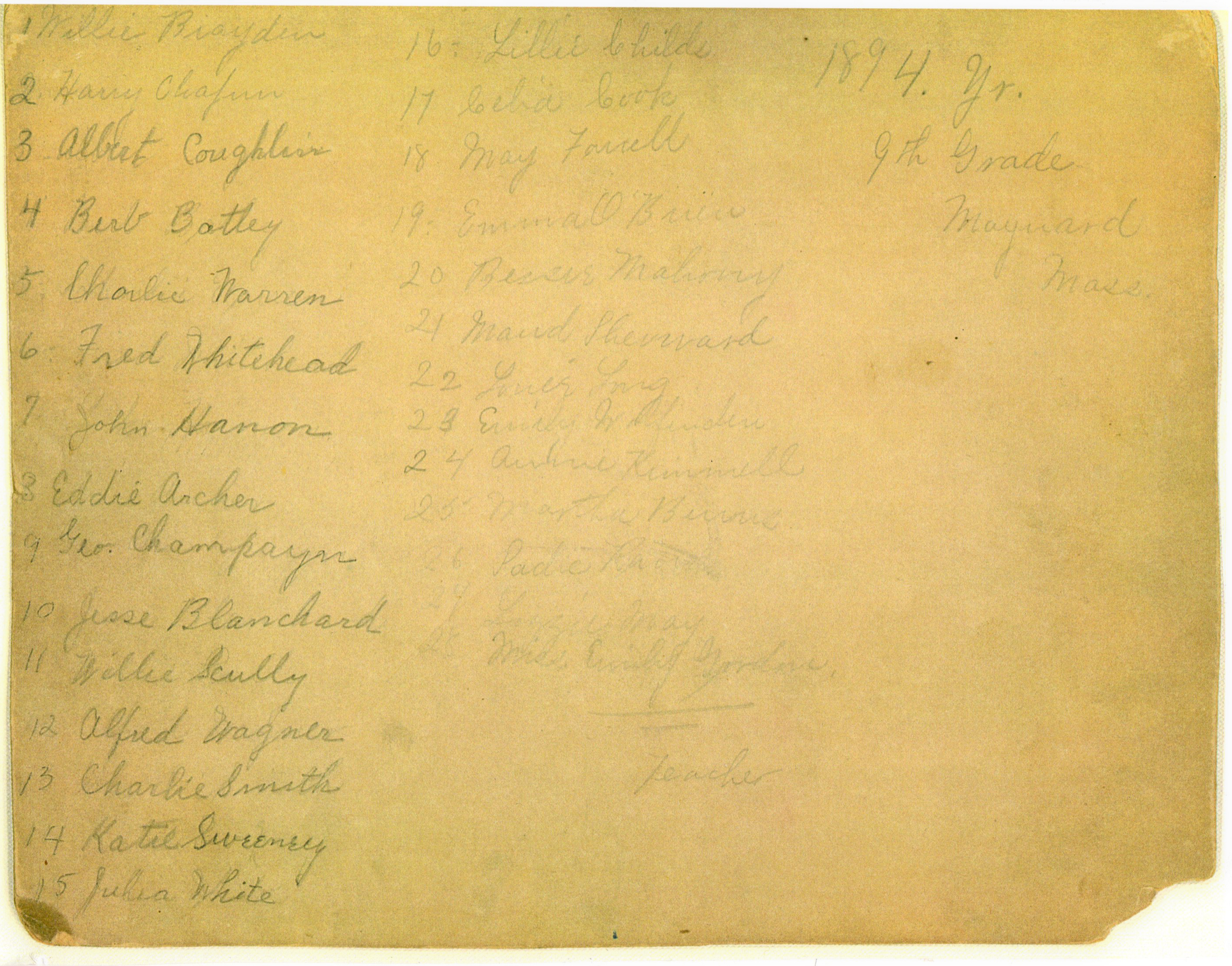 Willie Brayden, Harry Chafin, Albert Coughlin, Albert Batley, Charlie Warren, Fred Whitehead, John Hanon, Eddie Archer, Geo. Champagne, Jesse Blanchard, Willie Scully, Alfred Wagner, Charlie Smith, Katie Sweeney, Julia White, Lillie Childs, Celia Cook, May Farrell, Emma O'Brien, Bessie Mahoney, Maud Sherward, Lori Young, Emily Wolfinder, Arlene Kimmell, Martha Burns, Annie Buckley, Lizzie May, Emily Gordon - teacher