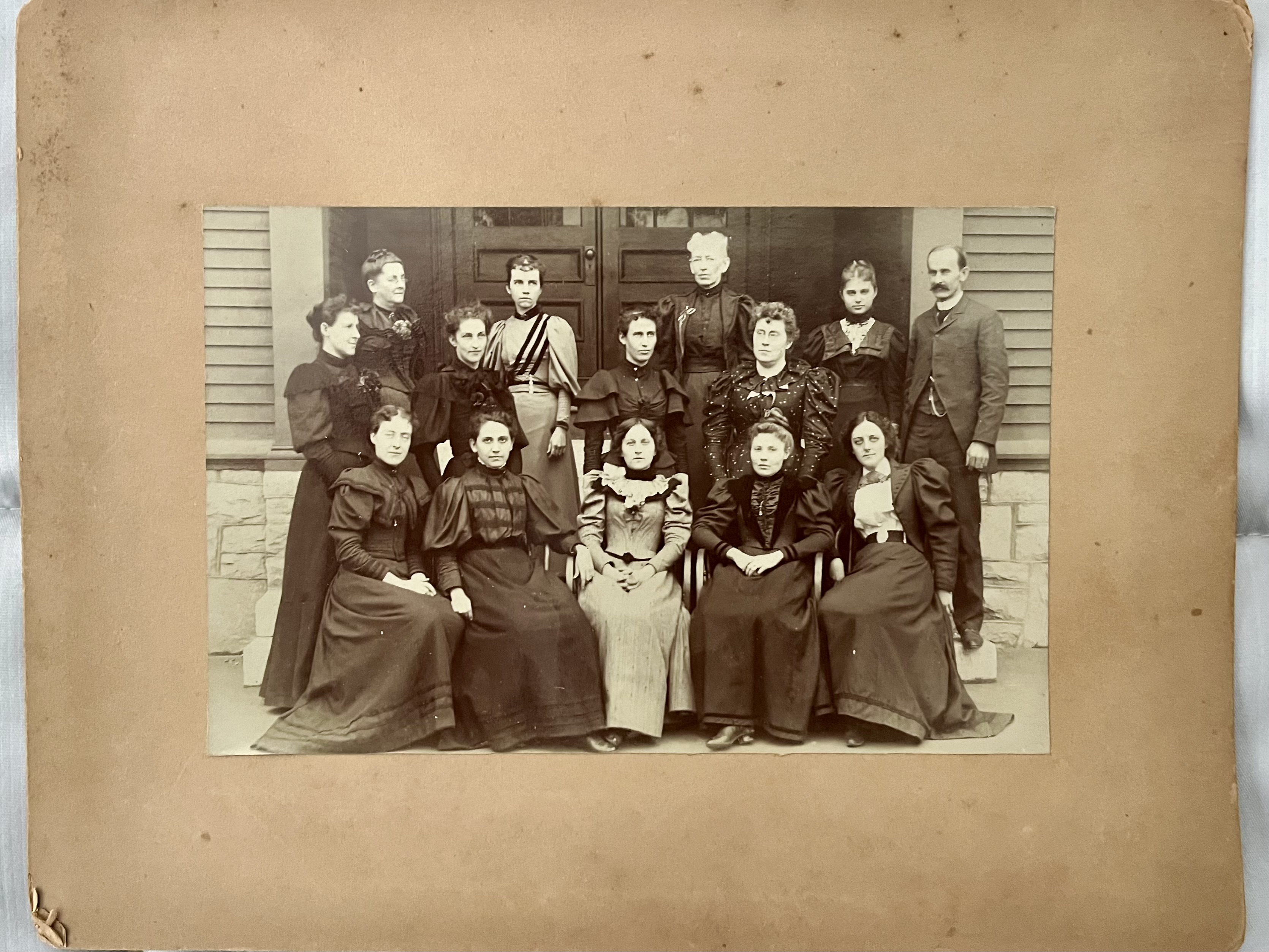 Back row standing (5): Rose Winkley. Alice Nagle, Emily Gordon, Blanc Evans Hazard, Elmer E. Sawyer