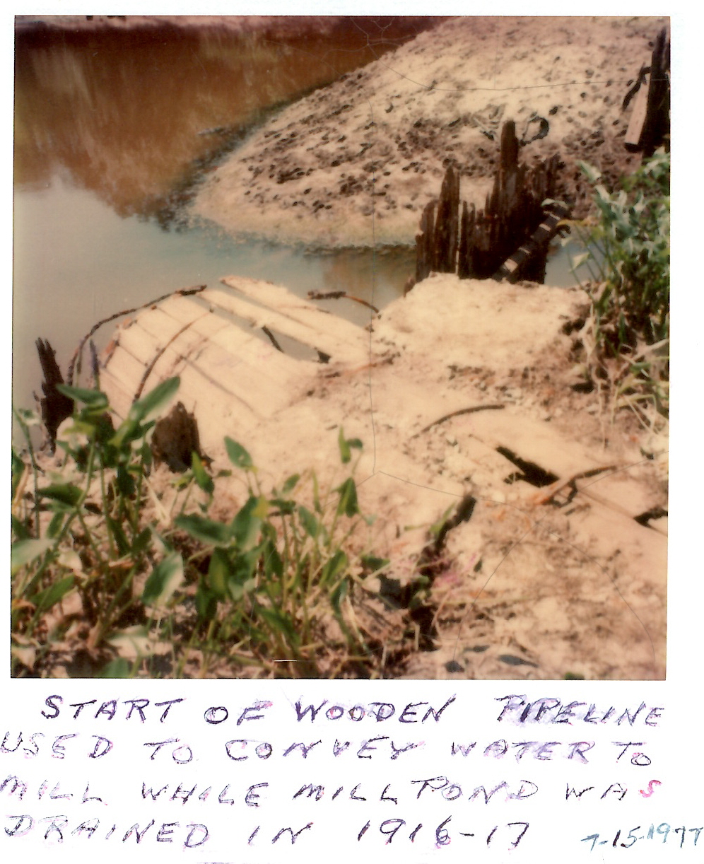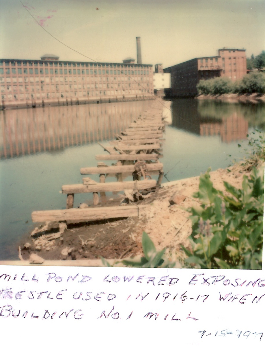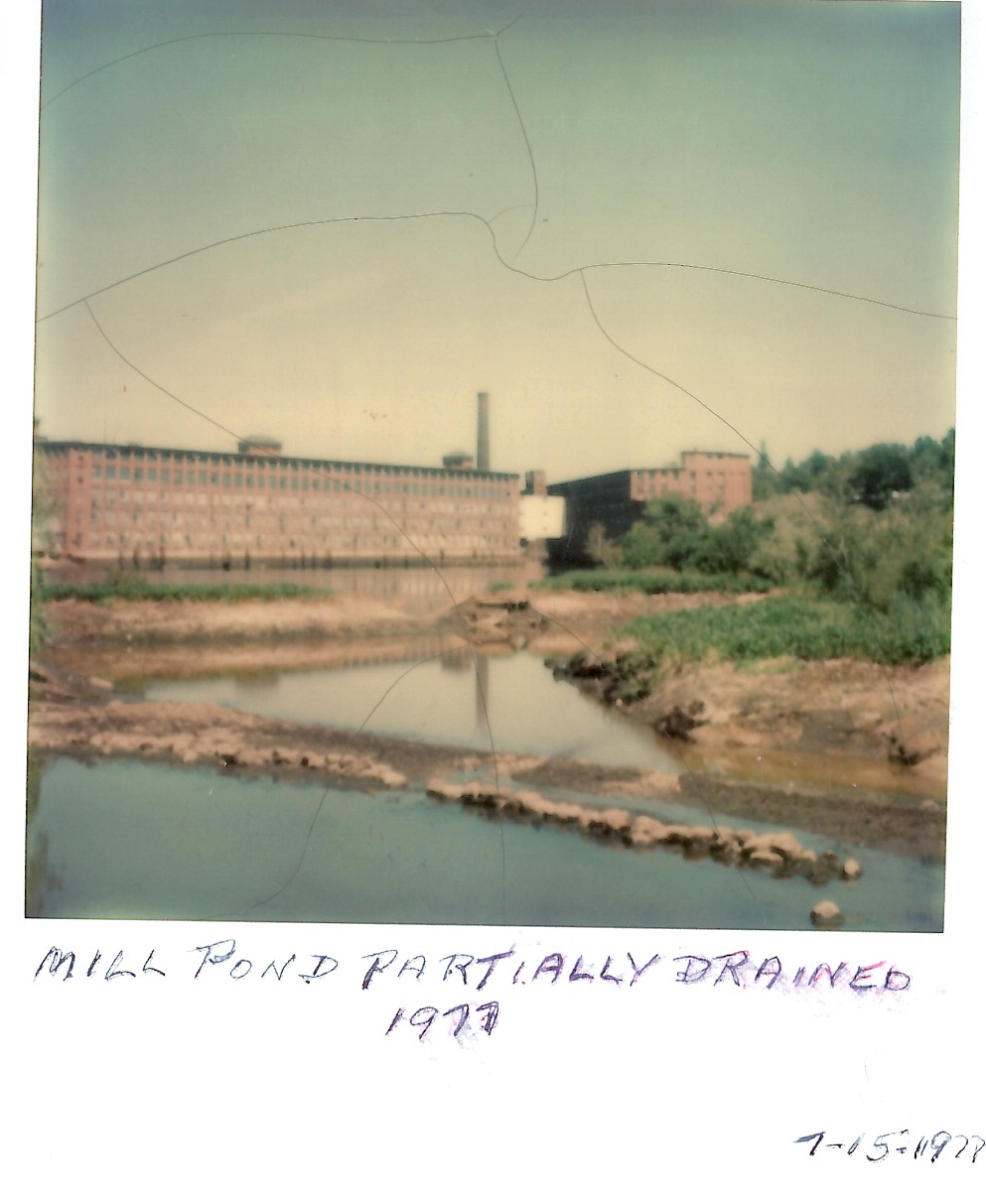12 color snapshots of the draining of the Mill Pond taken by Elizabeth Schnair, July 1977. One photo is of the exposed trestle used in 1916-1917 when building Mill No. 1. Another photo is of the wooden pipeline used to convey water to mill while Mill Pond was drained in 1916-1917.